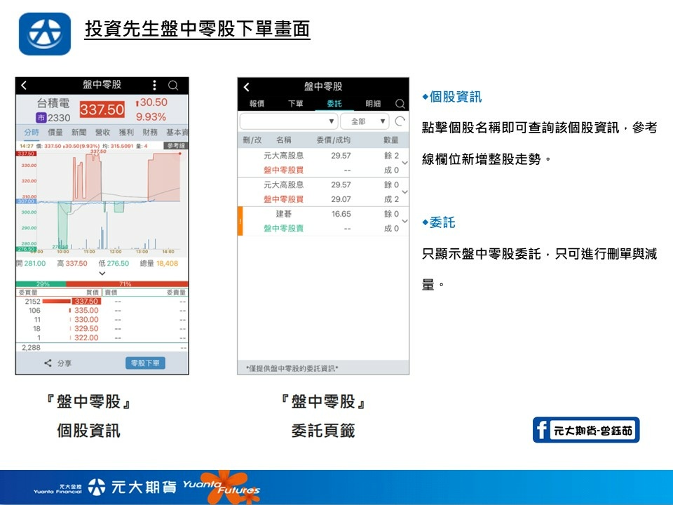 [11] 盤中零股交易之買賣委託依規定僅限電子交易方式,若您的電子交易委託因網路擁塞、網路斷線、斷電或電腦當機等不可抗力的情況而無法刪單,此委託單仍會撮合,本公司不負擔相關風險及責任,屆時請自行查詢委託及成交狀態。